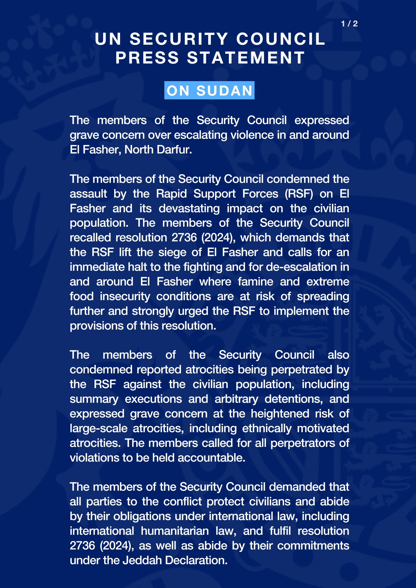 وأدانوا هجوم قوات الدعم السريع على الفاشر وأثره المدمر على السكان المدنيين. واستذكروا القرار 2736 (2024)، الذي يطالب قوات الدعم السريع برفع الحصار عن الفاشر، “ويدعو إلى الوقف الفوري للقتال وتهدئة الأوضاع في الفاشر وما حولها، حيث يُخشى من انتشار المجاعة وانعدام الأمن الغذائي الشديد”، وحثوا قوات الدعم السريع بشدة على تنفيذ أحكام هذا القرار.