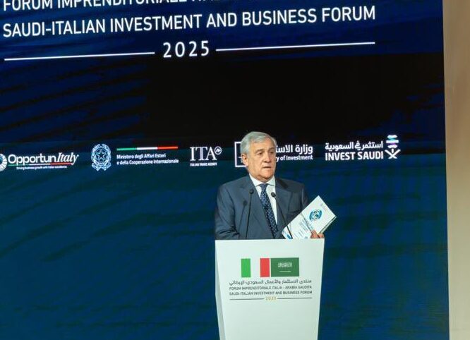 وقال الوزير تاياني في كلمته الختامية لمنتدى الأعمال الإيطالي السعودي بالرياض الثلاثاء: “نريد الاستثمار وتعزيز التصدير إلى السعودية”، كما “نرغب أيضًا بإقامة مشاريع مشتركة مع شركات من هذا البلد الرائع والمتنامي باستمرار لتعزيز حضورنا في القارة الأفريقية، والتواجد في سورية، وأينما أمكننا العمل معًا لتعزيز النمو وبناء السلام والازدهار”.