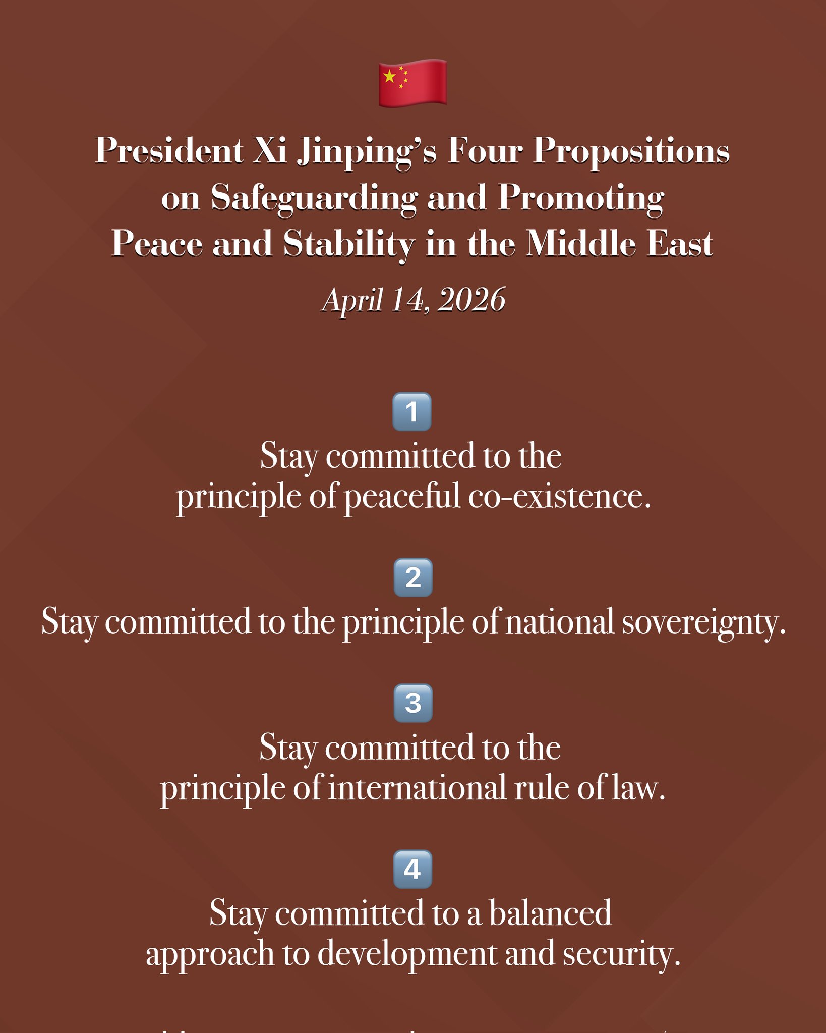 وأشارت وزارة الخارجية الصينية في منشور على وسائط التواصل الاجتماعي إلى أن الرؤية تتضمن: “أولا، التمسك بمبدأ التعايش السلمي، فـ”دول الشرق الأوسط بما فيها دول الخليج جيران يعتمد بعضهم على البعض ولا يمكن نقلهم جغرافيا”.